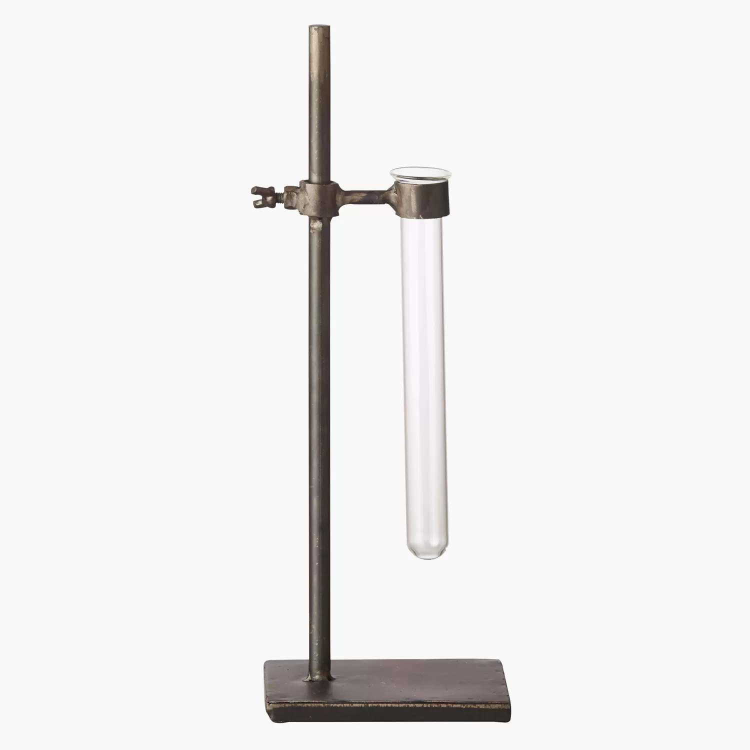 Rörformad vas i munblåst klarglas som står i ställning av metall. En stilren modell i industriell look som låter en enkel blomma eller kvist sprida grönska och harmoni i ditt hem.