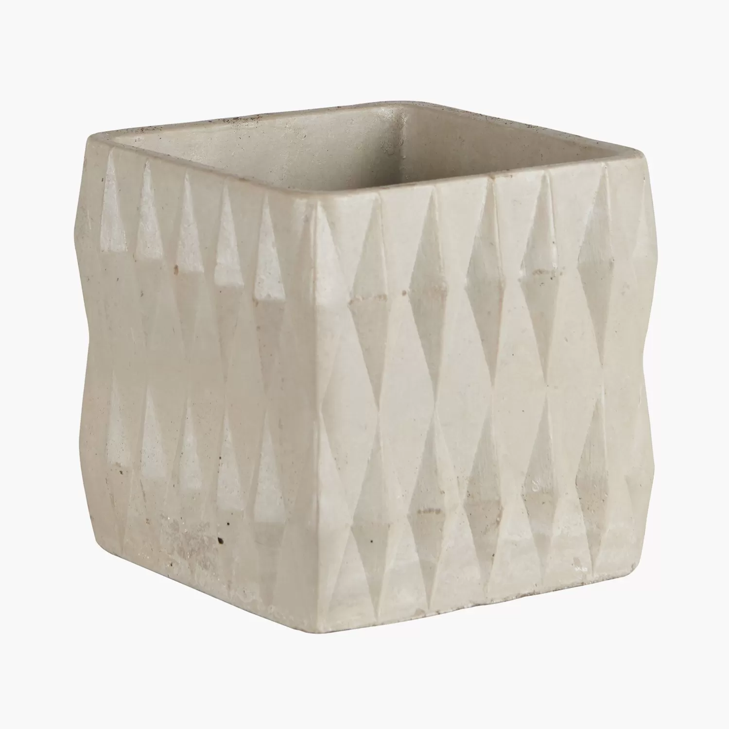 Det diamantformade mönstret och det grånyanserade materialet i denna kruka utgör en stilren och modern detalj i ditt hem. När en blomma placeras här i skapas ett naturligt och jordnära inslag i din inredning. En rustik detalj som är förenlig med den industriella stilen men som tillåter att skapa naturliga inslag inomhus.