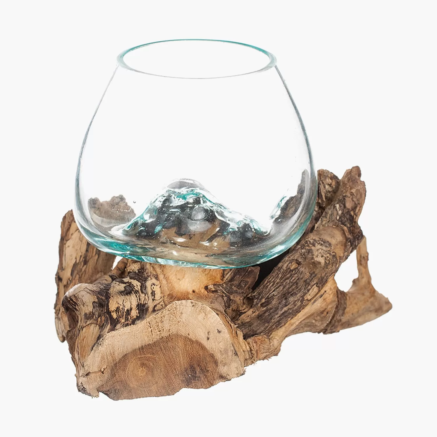 Handgjord glasskål på trädrot.