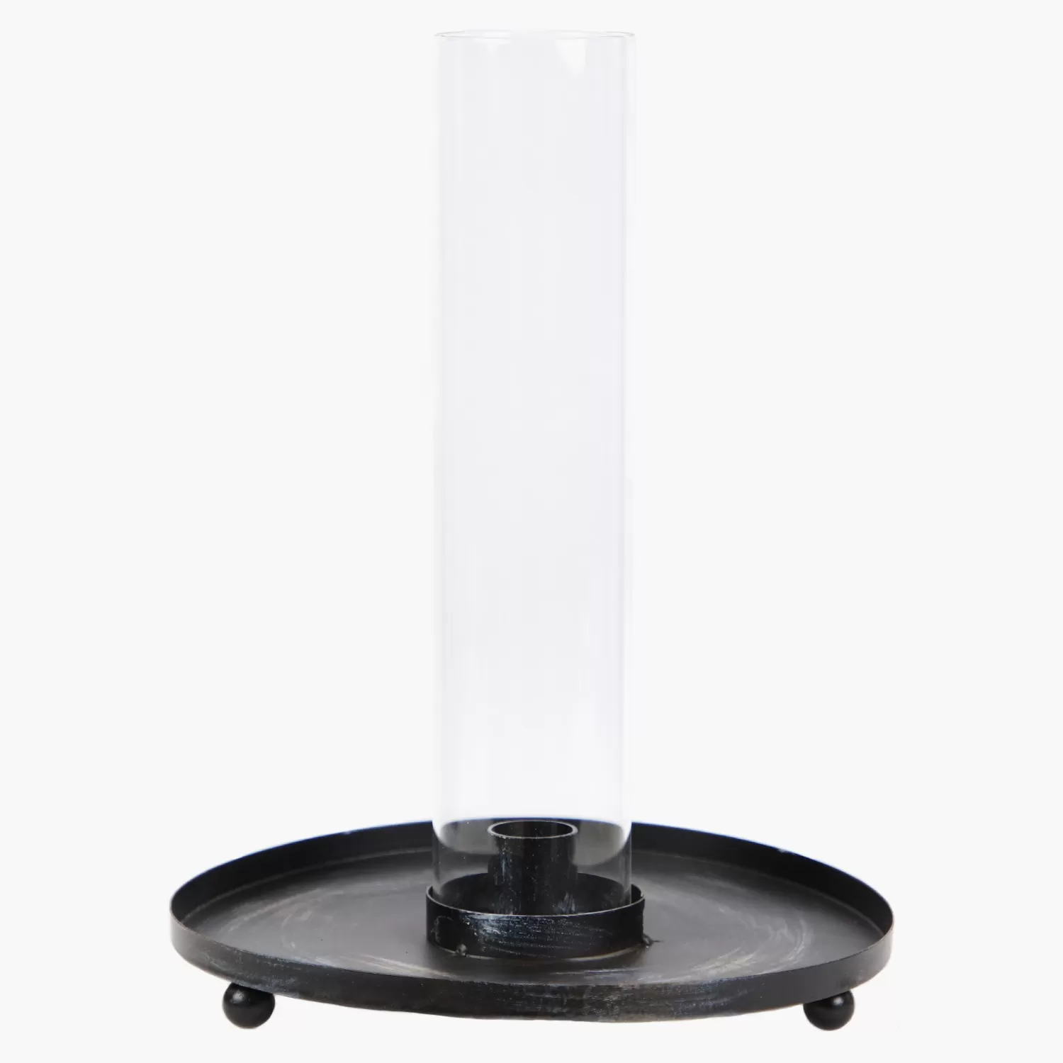 Detta är en ljuslykta med många möjligheter! På fatet i vintagestil gjort av svart metall kan du dekorera denna ljuslykta på vilket sätt du vill. Kanske föredrar du att pynta efter säsong med det naturen har att erbjuda såsom kottar, kastanjer och andra växter. Kanske vill du hellre dekorera den inför högtider till exempel med små julgranskulor i olika färger eller små påskägg i olika material. Oavsett vad du föredrar är dina möjligheter oändliga! Naturligtvis är ljuslyktan lika snygg så som den är, med svart fat och glasrör. Den blir en lika mångsidig som trendig produkt i vilket hem som helst som uppskattar en modern, rustik och industriell stil! Fatet är cirka 20cm i diameter och glasröret är cirka 25cm hög.