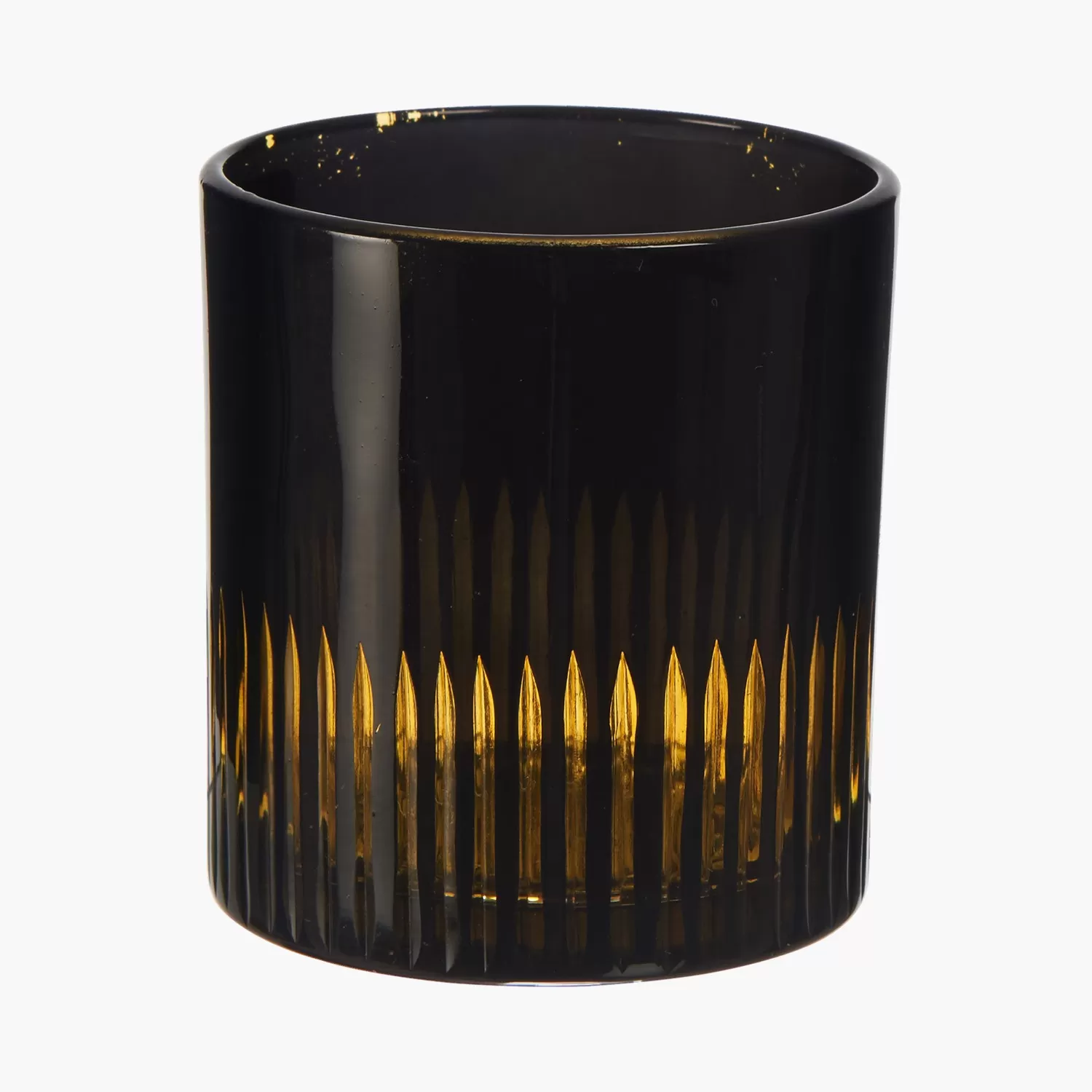 En ljushållare i glas i modern och vågad design med lackerad utsida. Ljushållaren är 9 cm hög och 8 cm bred. Med kulörer i svart och gult är detta en ljushållare för dina värmeljus som sticker ut och som ger ditt hem det där lilla extra. Lika effektfull för sig själv som i en grupp av flera. Formen är mjuk och klassisk men här får den ett nytt utseende som skapar en lekfullhet i din inredning. Ett häftigt och utrycksfullt inslag i det minimalistiska eller industriella hemmet tack vara den spännande färgsättningen men den ändå bibehållna elegansen och formgivningen. Undvik kontakt med väta då ljushållarens färg kan släppa.